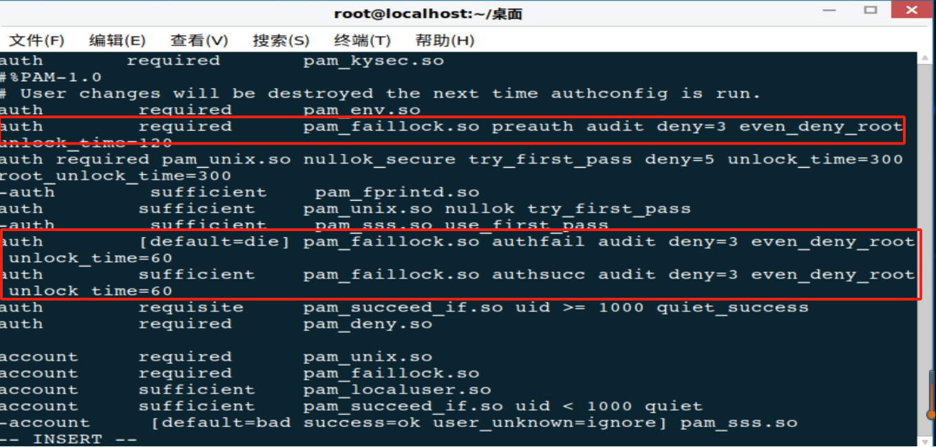 步骤 1.修改/etc/pam.d/system-auth文件 vi /etc/pam.d/system-auth 找到包含 pam_faillock.so 的行,修改以下参数(可根据实际需求进行配置): deny:允许的最大认证失败次数(默认通常为 3)。 unloc ...